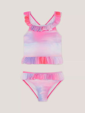 You'll never lose little ones amongst the sandy shores with this bright and beautiful bikini set. The top features a crop-style in a palm print, colourful straps to the shoulders, and matching bikini bottoms. Made using recycled materials, helping us to reduce our impact on the planet.