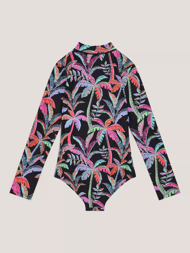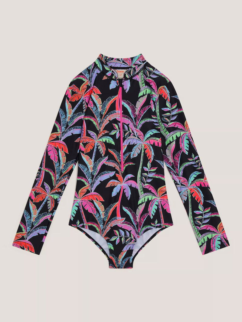 Kids' Tropical UPF50+ Long Sleeve Swimsuit, Black