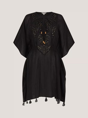 A seaside essential. Made from a breezy cotton fabric, this kaftan-style dress showcases a vibrant print of seashells and starfish with a scalloped plunge neckline. Finished with tassel ties at the waist, it's the perfect pick for layering over swimwear.