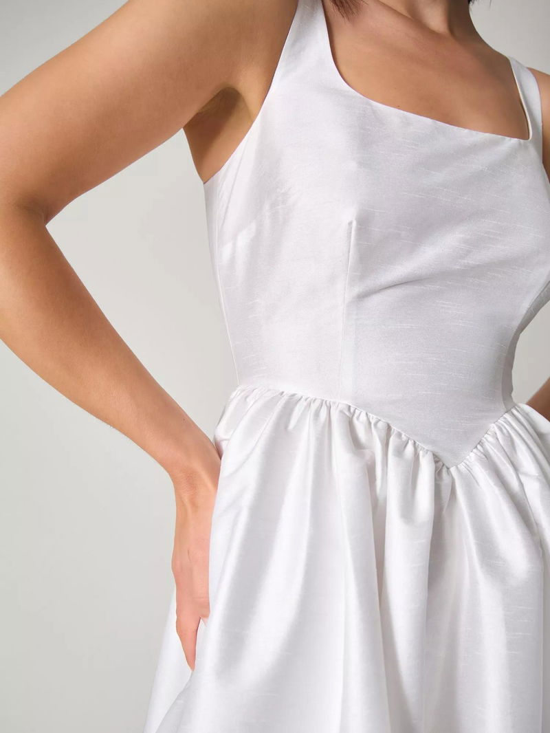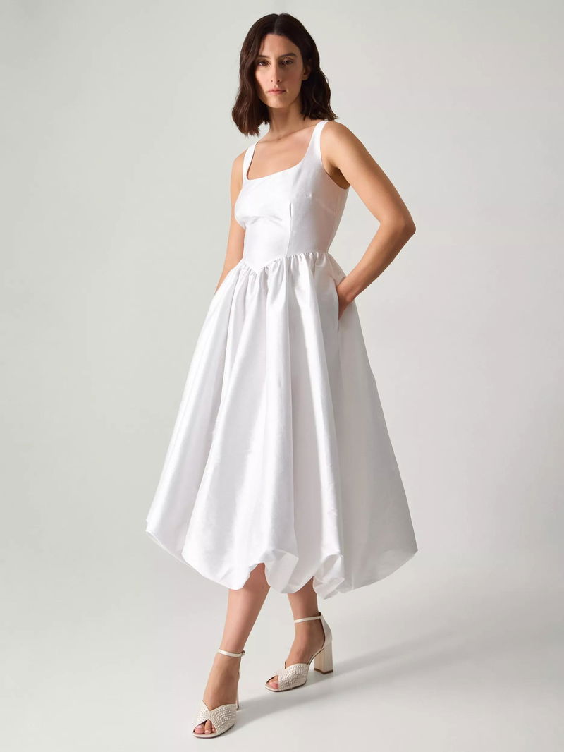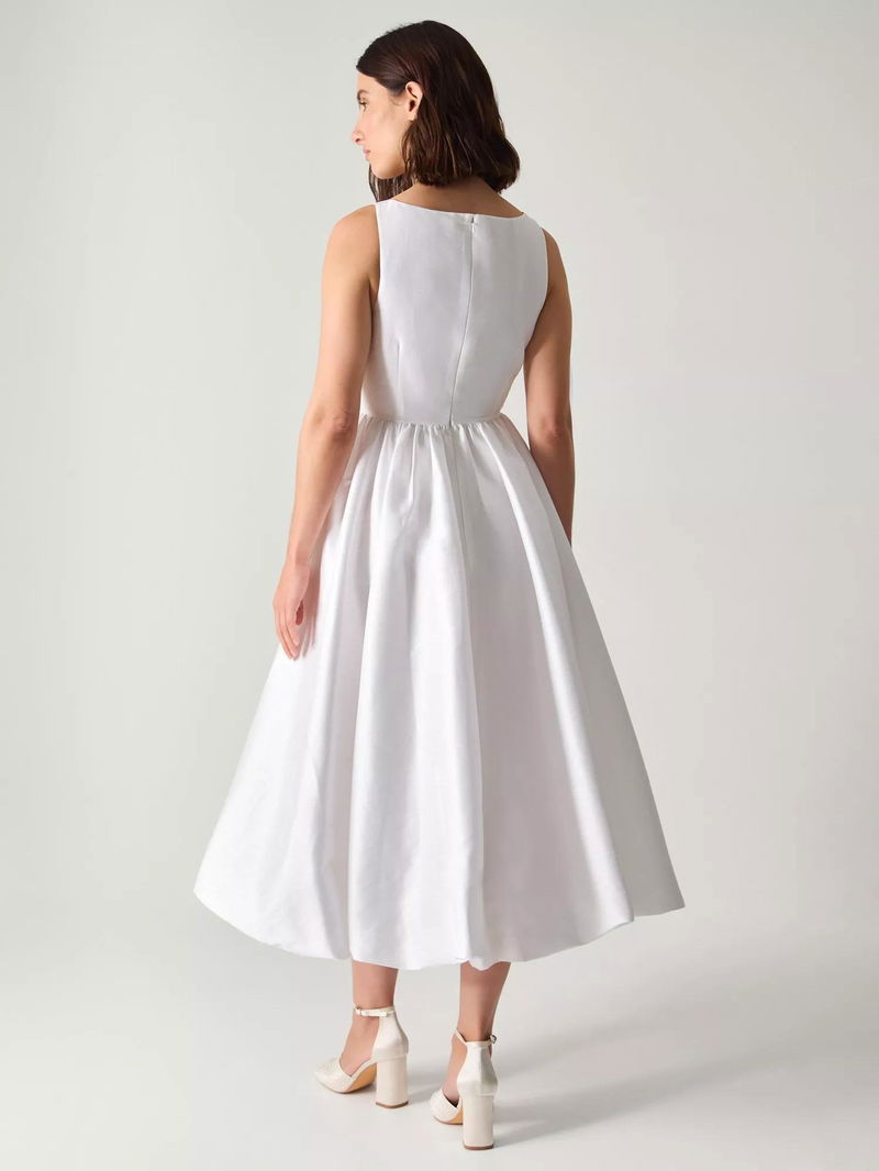 This midi bridal dress features a flattering fit and flare silhouette with a drop waist, a sleeveless design, and a modern square neckline. The comfortable lining and understated style help you feel your best on your day.
