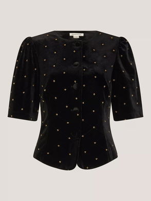 Made from luxe velvet and embellished with gold spots for a touch of sparkle, this top is primed for evening plans. Cut with a flattering V-neckline and 3/4 length sleeves.