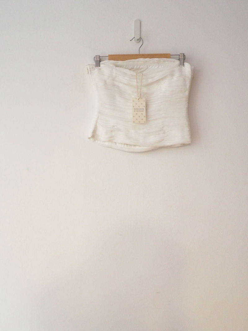 OOO uniform. Form-fitting and brimming with charm, this bandeau top is designed with ruched pleating, optional straps and an elegant scarf to drape and style however you wish.