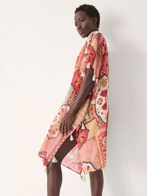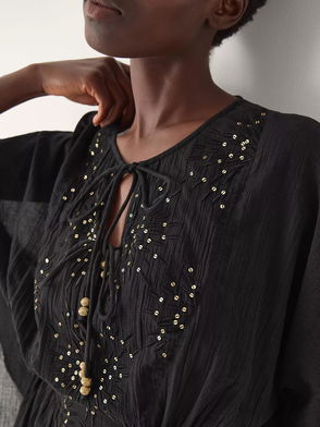 Description: Embroidered with swirling suns through the kaftan silhouette, this dress features a cinched waist for easy shaping with an open, V-neckline and draped sleeves. Pair with your fave sandals for easy summer glam. Materials: 100% EcoVero viscose Product Code: 113696026