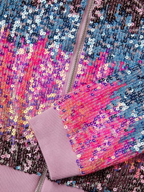 Designed with a soft cord-like velour fabric and a glittery stripe at the hems, this bomber jacket is a stylish addition to their wardrobe.