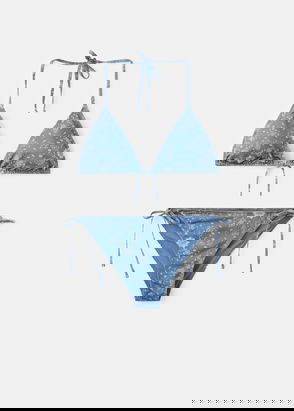 This striped bikini includes a top with asymmetrical straps and standard briefs.