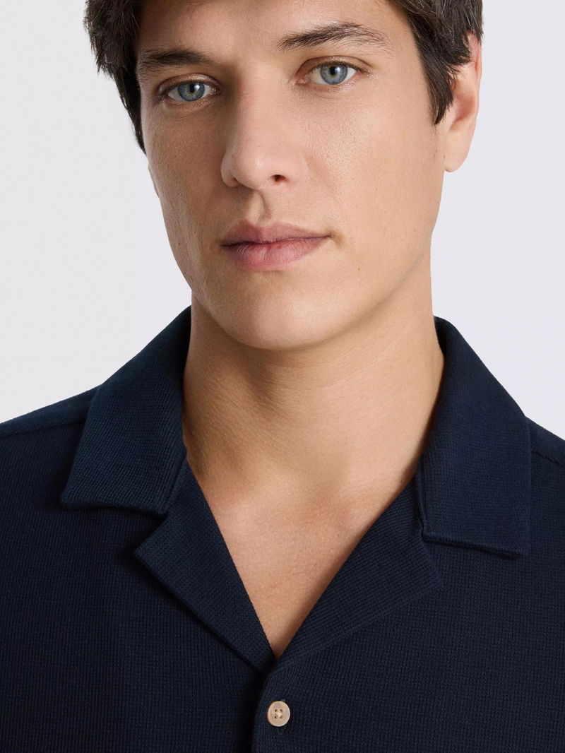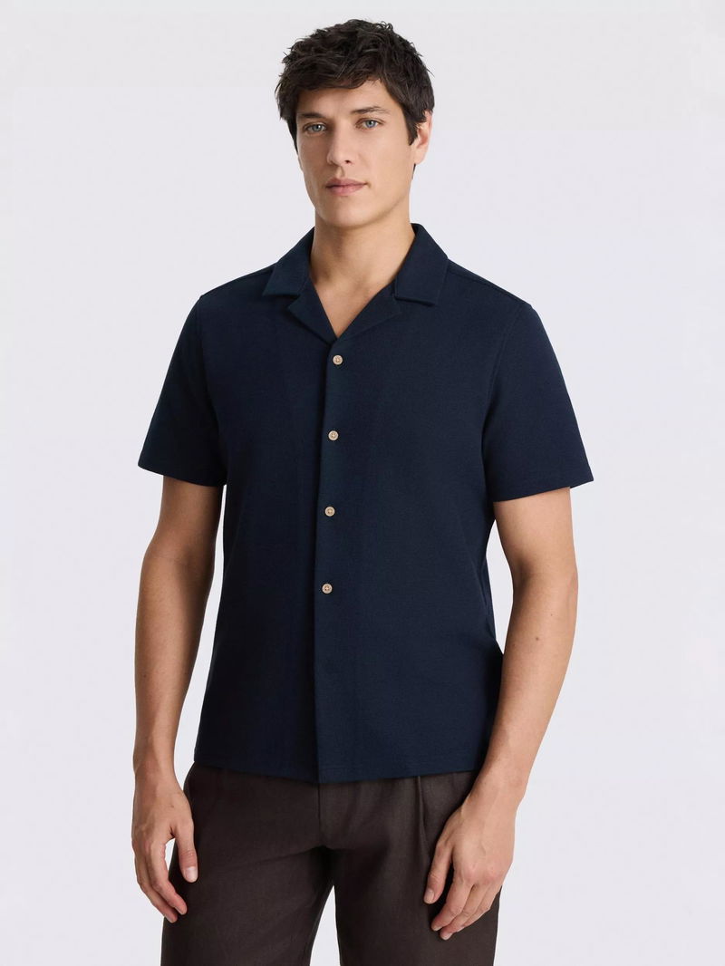 Cotton Blend Regular Fit Textured Cuban Collar Shirt, Navy