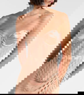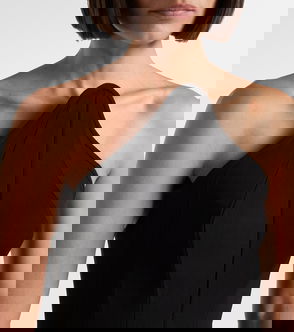 Best known for its sculptural silhouettes, the Parisian house of Mugler challenges conventional fashion design. The fitted top features asymmetrical shoulder straps and sharp cut-outs for a directional, body-framing effect.