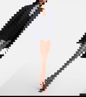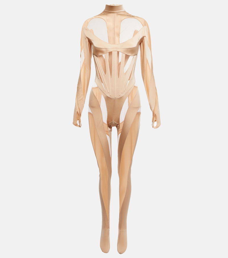 Represent avant-garde individualism with this jumpsuit from the famously disruptive fashion house, Mugler. The eye-catching design features a dramatically boned bodice and large mesh panels that spiral around your legs.