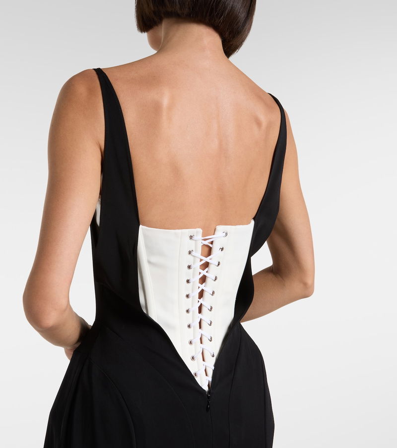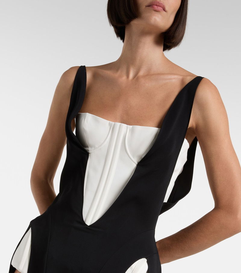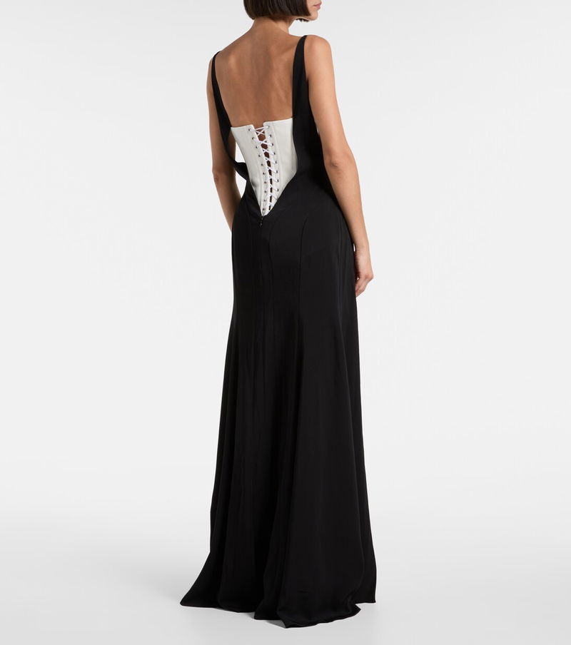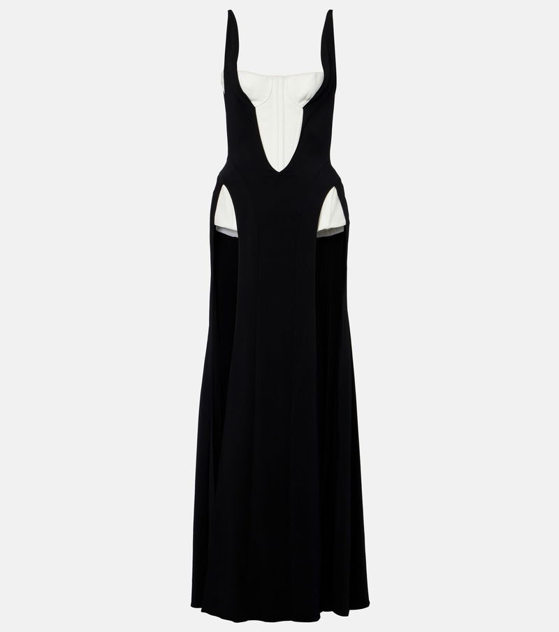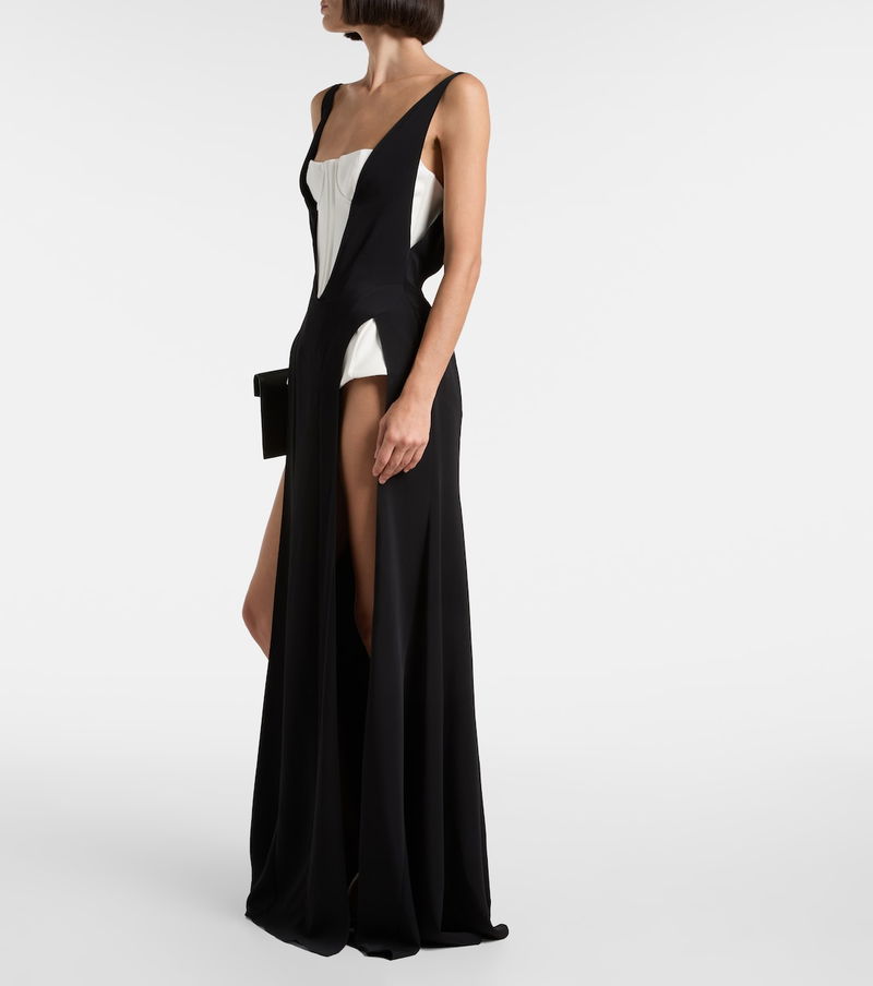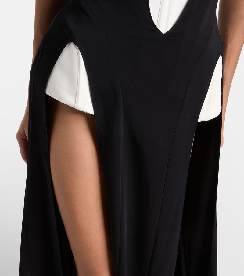 Mugler's re/edit capsule offers a reinterpretation of the house's signature archival pieces. Crafted from crêpe, this gown features a contrasting corset bodice, while the floor-length skirt showcases bold side slits.