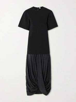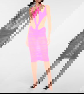 Best known for its sculptural silhouettes, the Parisian house of Mugler challenges conventional fashion design. This midi dress features a fitted turtleneck silhouette and contouring, ribbed-knit detailing.