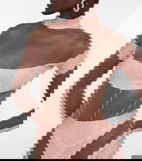 Best known for its sculptural silhouettes, the Parisian house of Mugler challenges conventional fashion design. This turtleneck bodysuit is made from velvet and has a crisscross back with a triangle cutout in the back.
