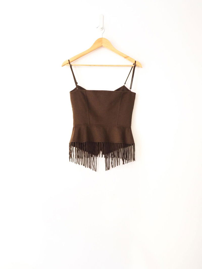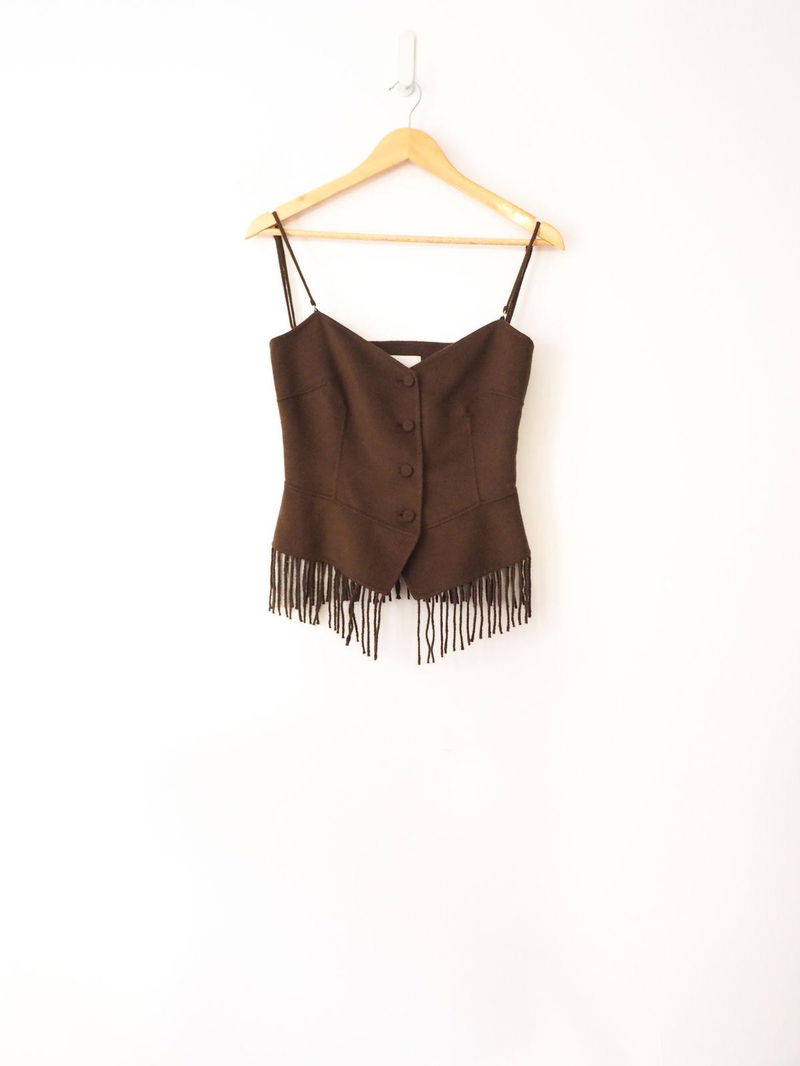Nanushka's Bafaro cropped sweetheart bustier in soil features part bustier, part waistcoat, a sweetheart neckline, spaghetti straps and flared fringe hem.