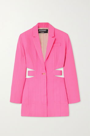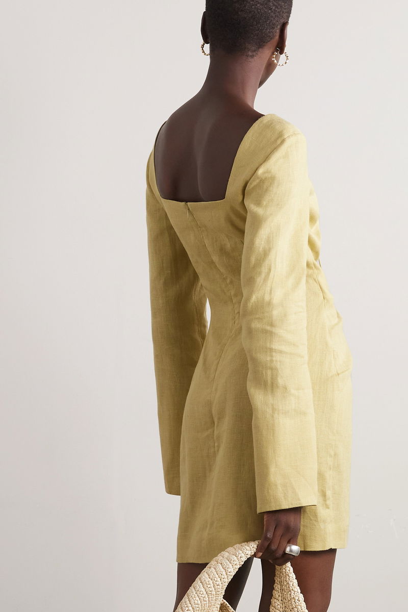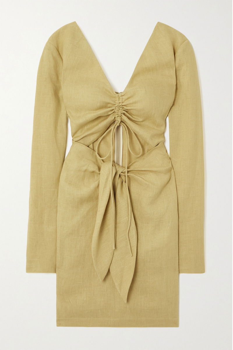 No fabric captures the spirit of summer quite like linen. Nanushka's 'Gilia' mini dress is designed with a knotted front and feminine ruching. Complement the neutral 'Oat' hue with gold jewelry.