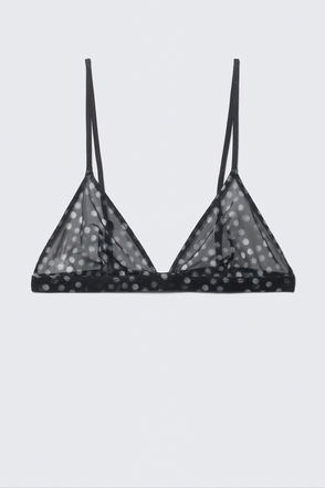 Contemporary femininity defines Nensi Dojaka’s design language, and this bra style is no exception. Made from sheer mesh with spaghetti-style straps and ribbon detailing, it’s topped with ruffled floral appliqués for flair and modesty.