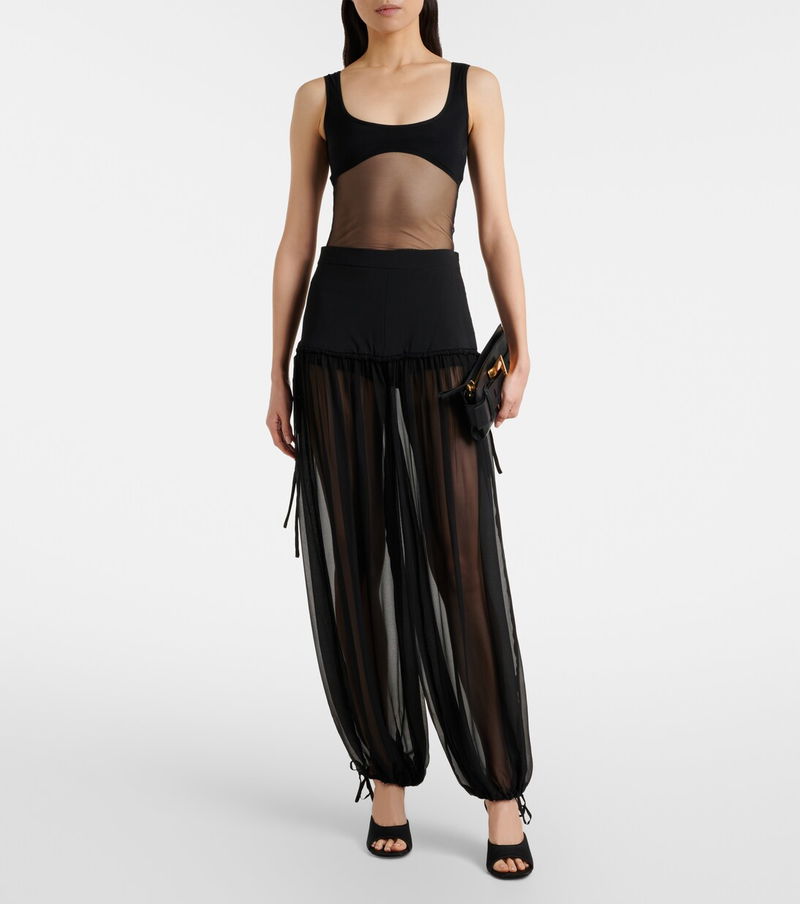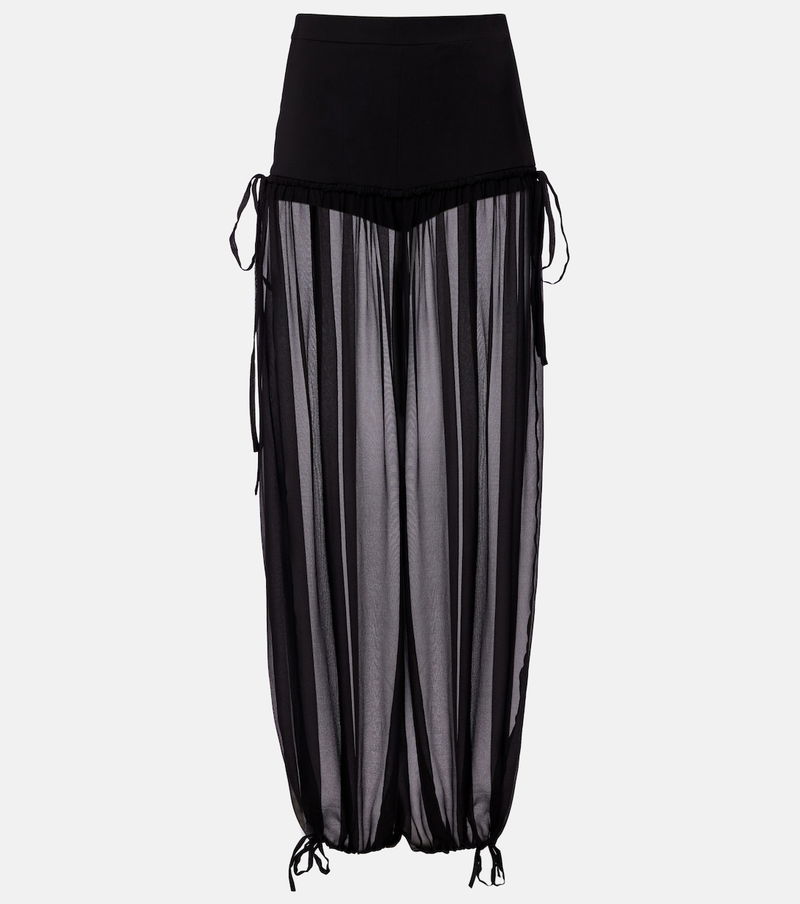 Alluring cutouts and intricate networks of straps have become synonymous with Nensi Dojaka's designs. Featuring a silk upper section, these striking pants showcase ethereal sheer legs in a voluminous flared silhouette, complete with drawstring ties at the sides and hems.