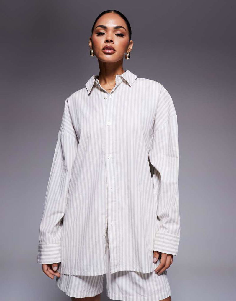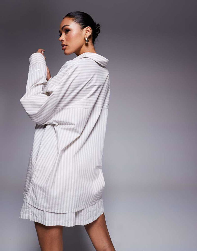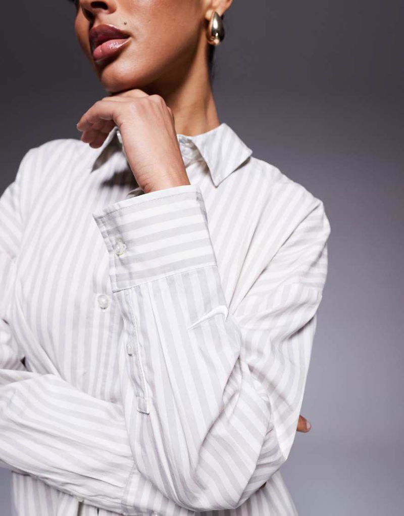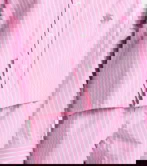 Stripe design. Spread collar. Button placket. Long sleeves. Logo embroidery to cuff