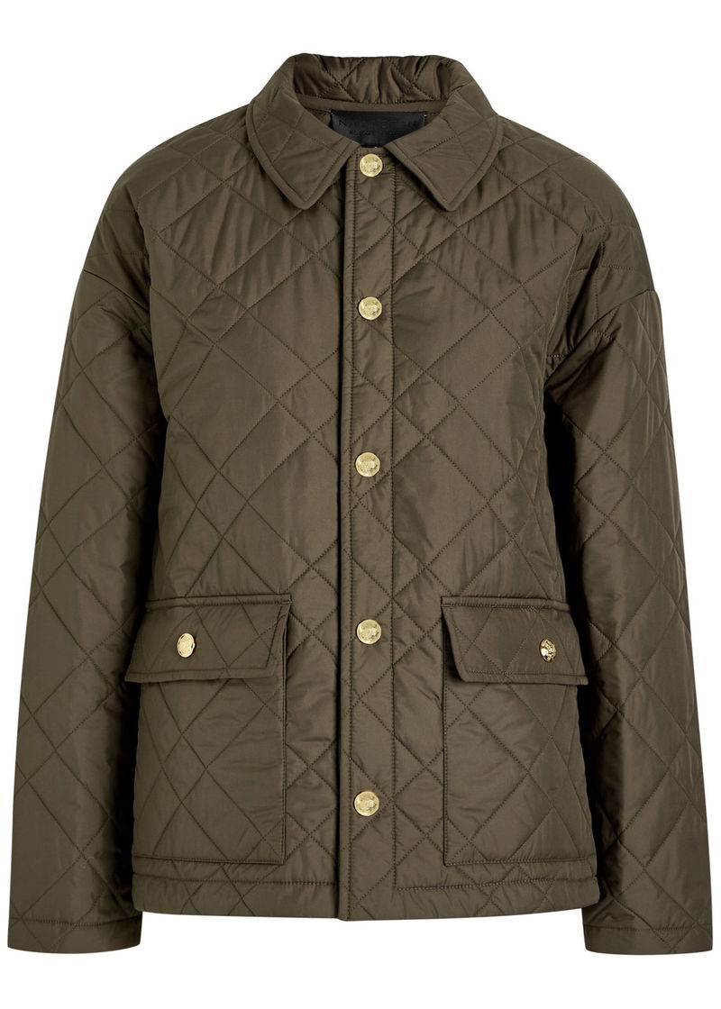 Nili Lotan shell jacket. Quilted, dropped shoulders, two press-stud fastening flap front pockets, press-stud fastening side splits, designer-engraved hardware. Press-stud fastenings through front.