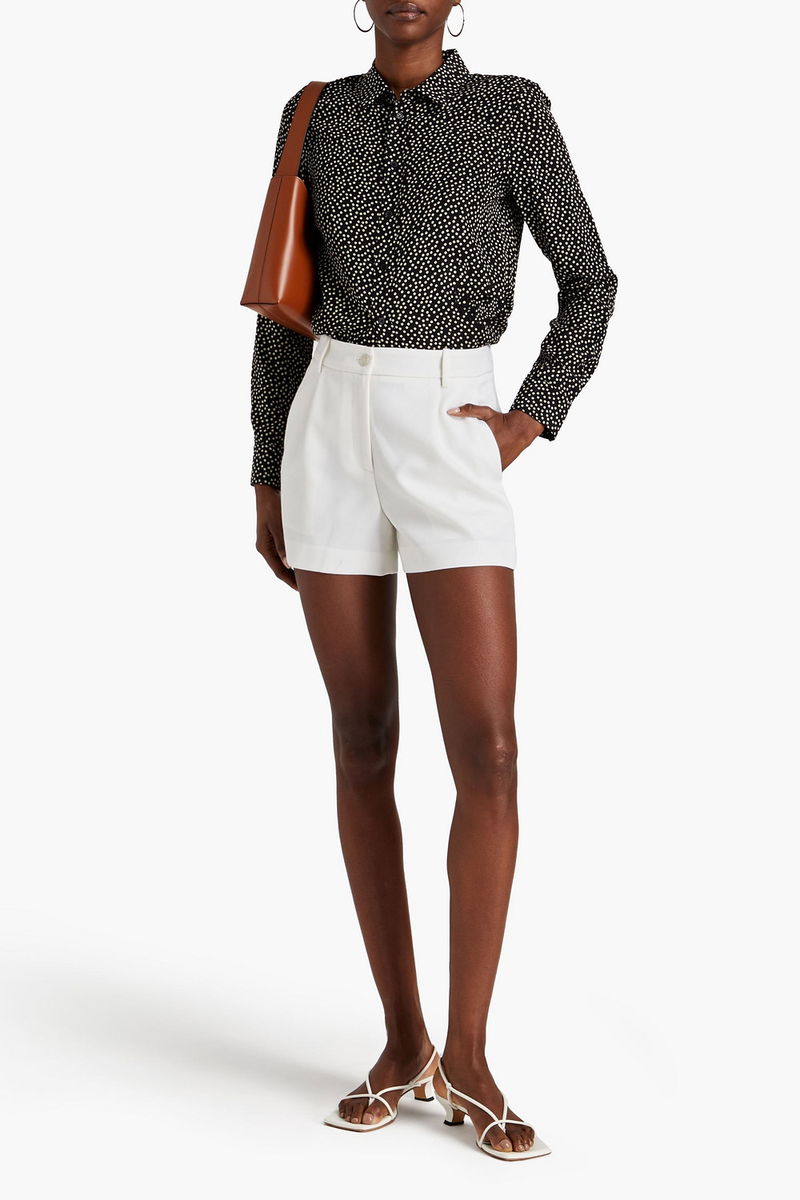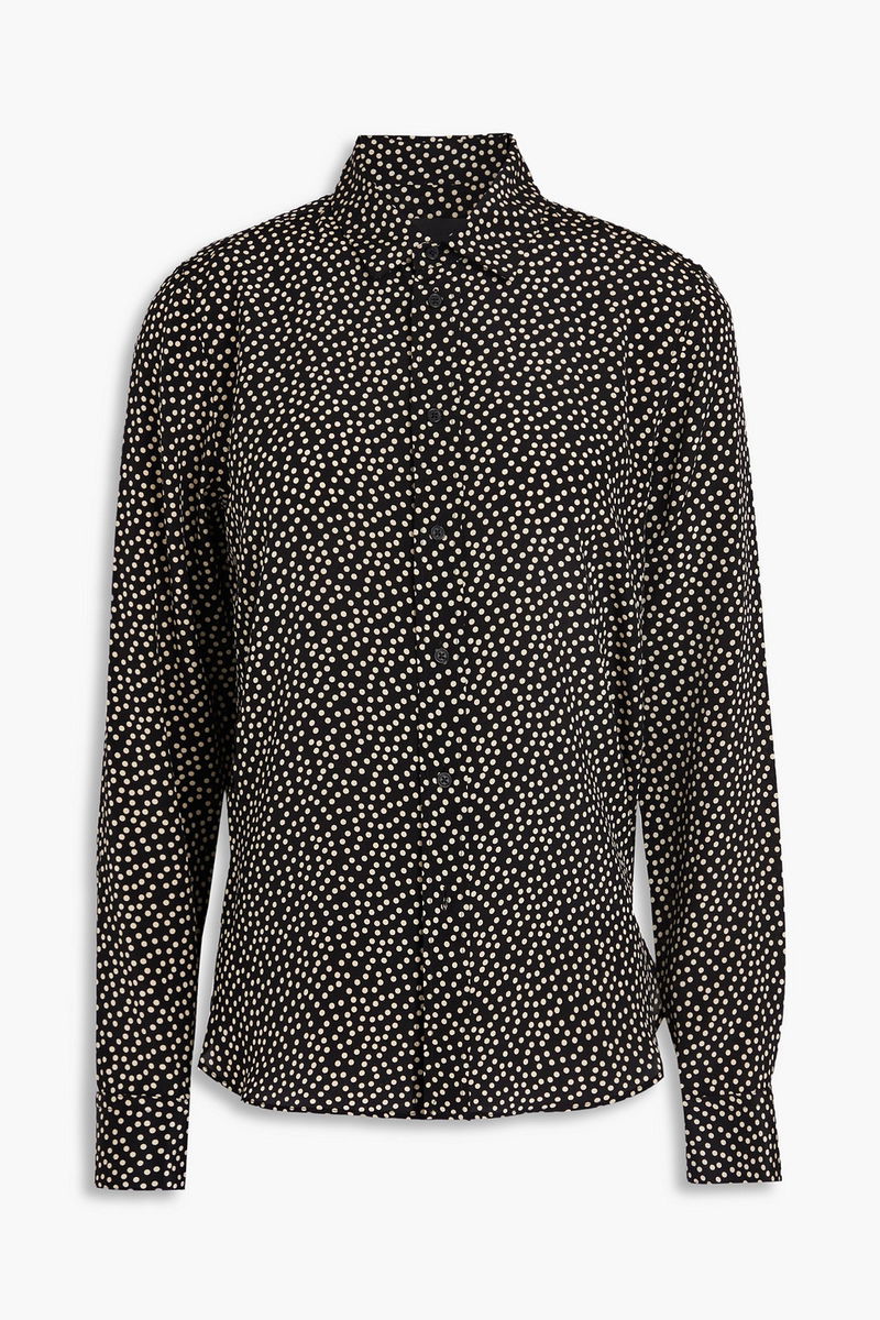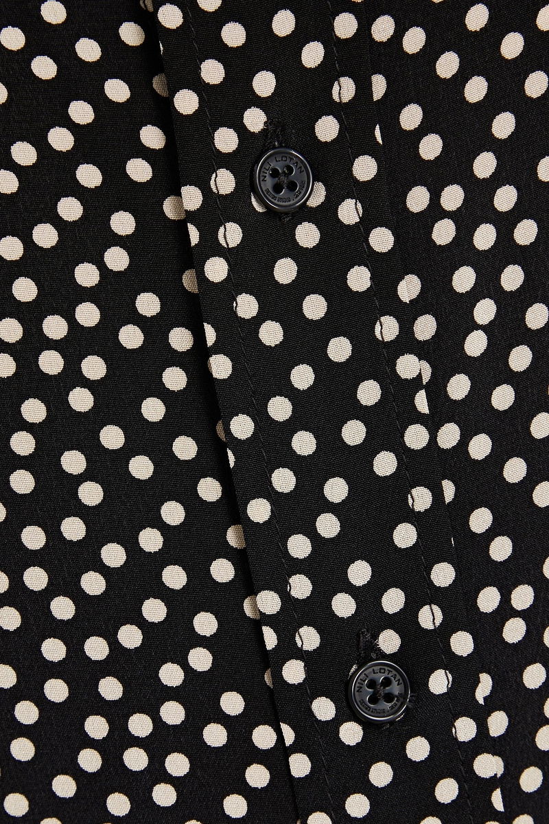 Shirt, Polka-dot, Silk crepe de chine, Buttoned cuffs, Side slits, Button fastenings through front, Non-stretchy fabric.