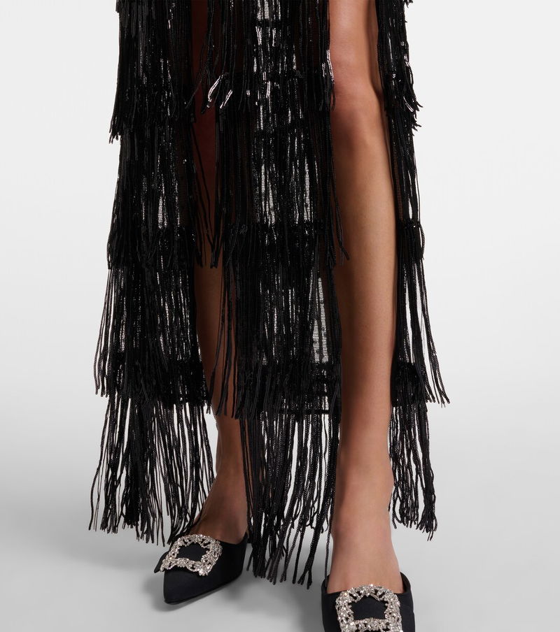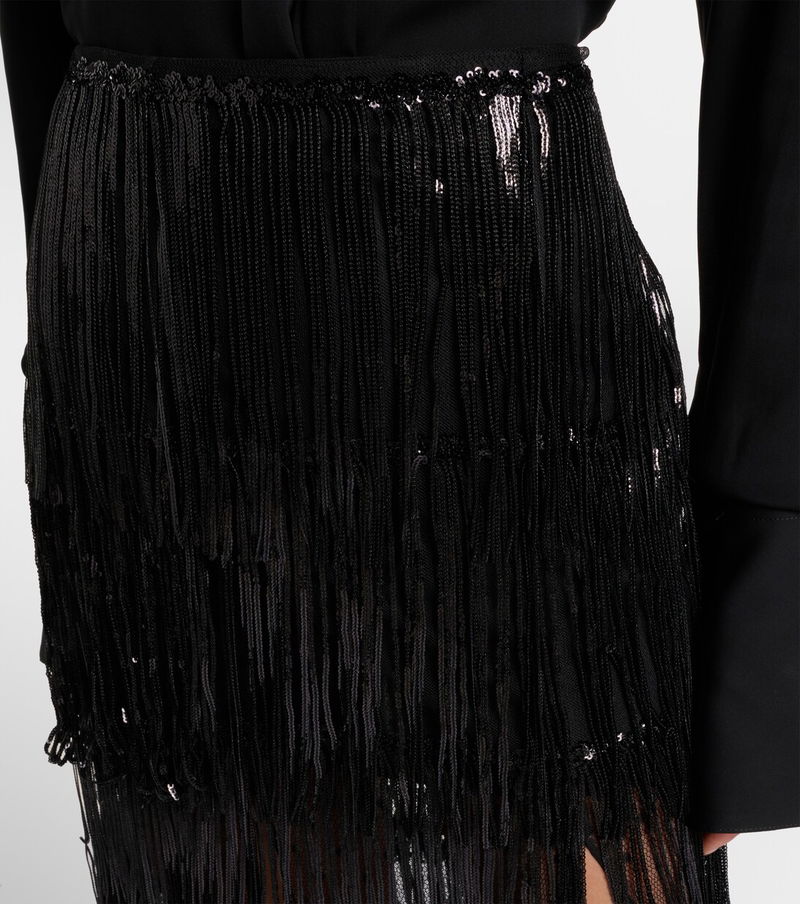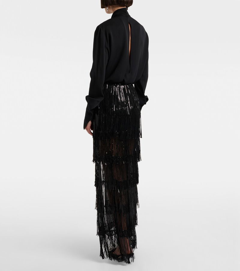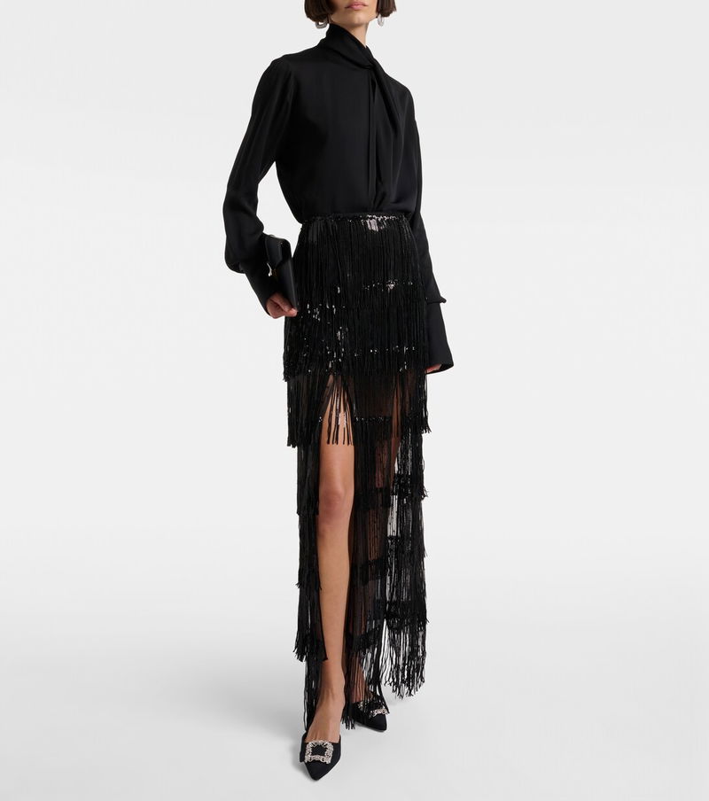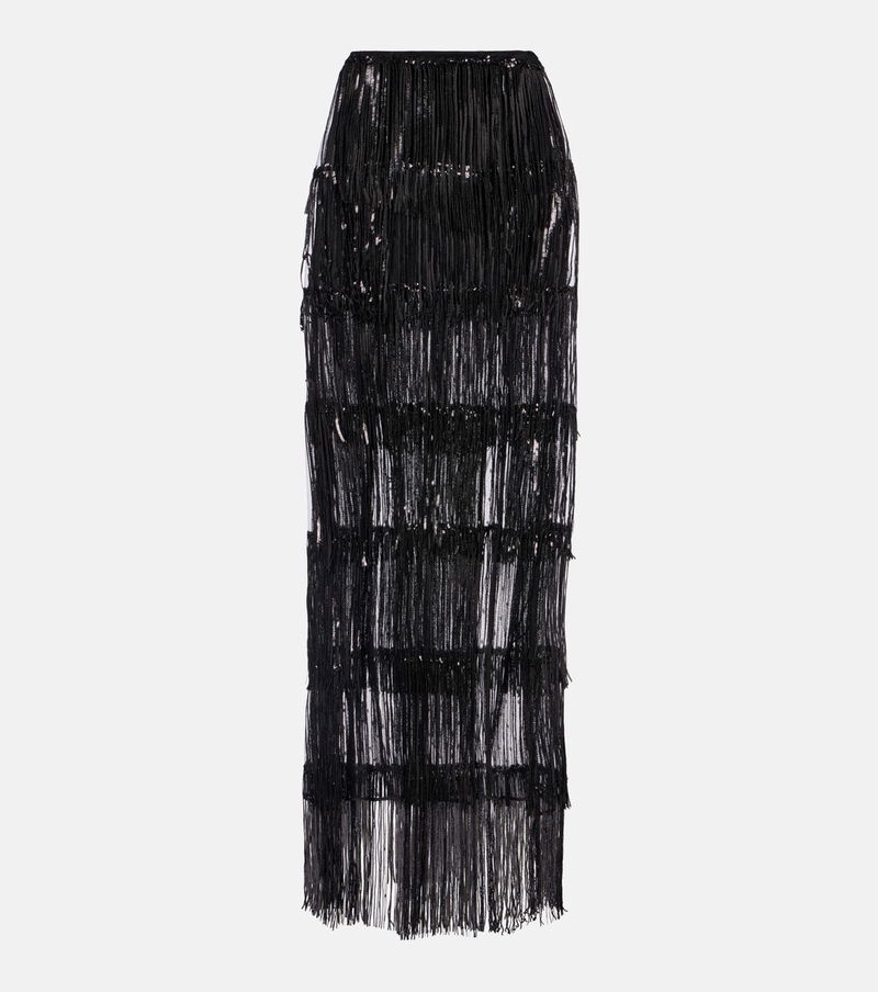 A skillful play of structure and proportion ensures the house of Nina Ricci remains a tastemaker for Parisian style. This show-stopping maxi skirt is cut from sheer tulle and finished with sparkling sequin fringes.