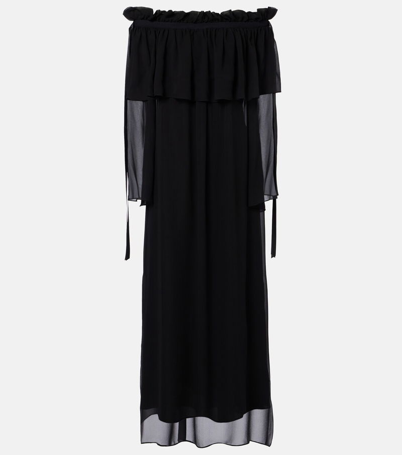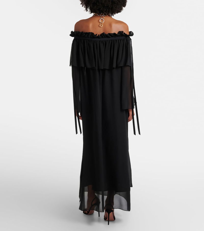 A skillful play of structure and proportion ensures the house of Nina Ricci remains a tastemaker for Parisian style. Crafted from silk, this sheer maxi dress showcases a gathered off-shoulder bodice and tie-straps on both sides.