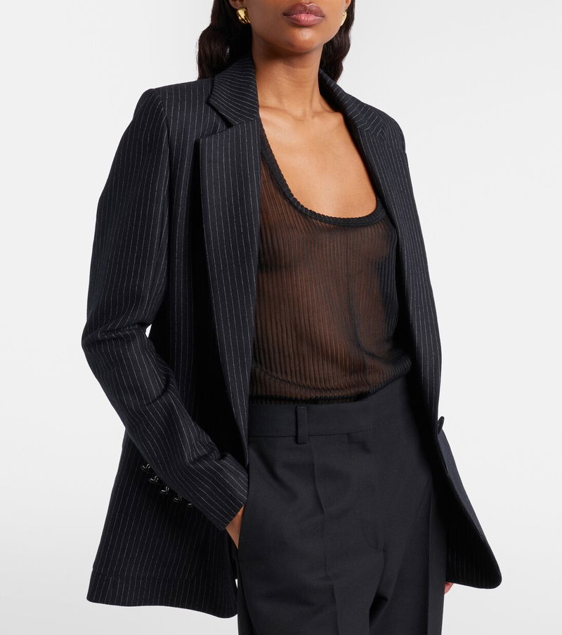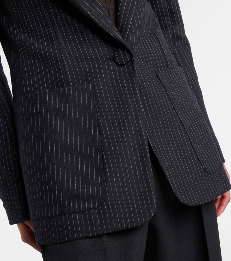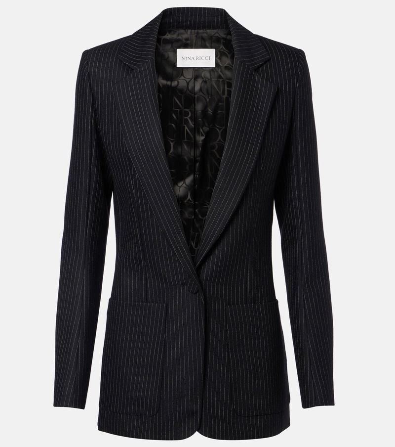 A skillful play of structure and proportion ensures the house of Nina Ricci remains a tastemaker for Parisian style. This blazer is made from a soft wool blend and finished with a pinstripe motif.