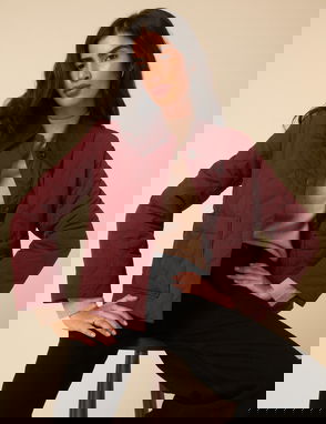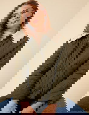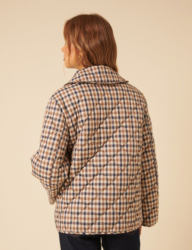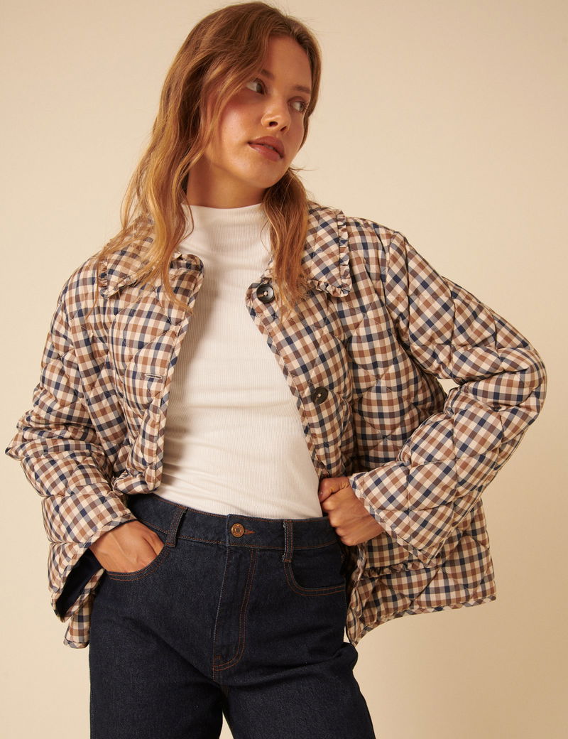 Your city-to-cabin jacket. In a brown and blue check, this quilted jacket features a frill collar and patch pockets. We love its brown button front and relaxed fit that’s perfect for warm layering.