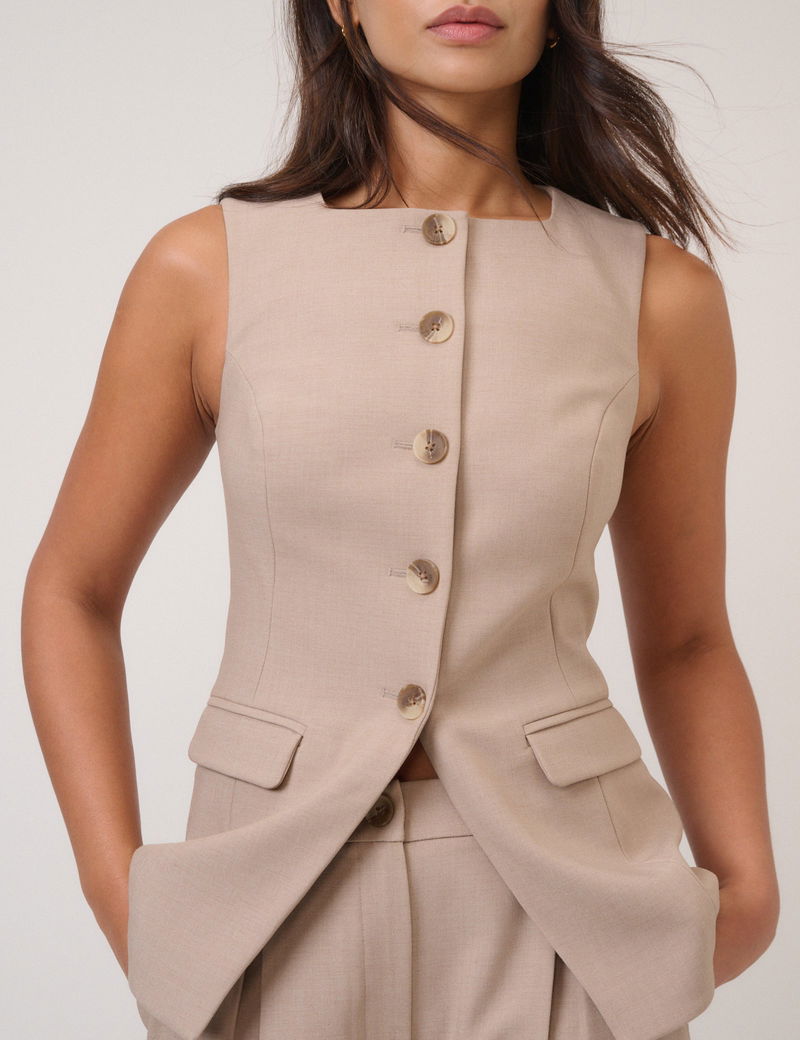 This beige waistcoat features a square neckline, mock horn buttons and pinstripe lining. Cut to a close-fitting, longline silhouette, neat seams run down the bodice and a tie-back detail adds a tailored cinch.