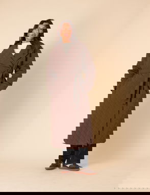 This cream trench coat features a collar, brown buttons and cape-style back. Cut to a relaxed fit, it’s finished with a purple and brown gingham lining, a tie-style belt and epaulettes.