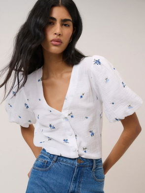 The sell-out Bernadetta blouse is back with short sleeves for summer. This shirt comes in a stylish boxy fit with mid-length puff sleeves. For that classic so-now look, she's also finished with a trio of string ties that line the front. Elevate yours with gold jewellery.