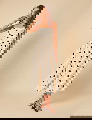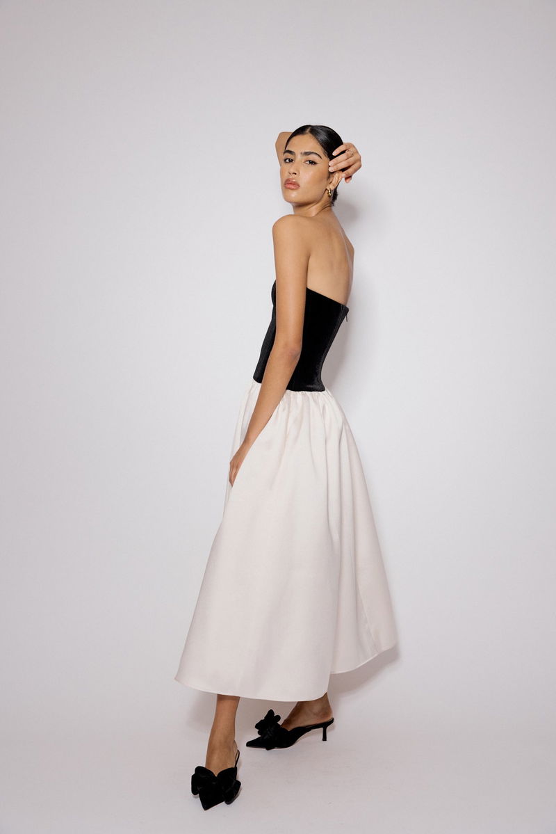 This bandeau midi dress features a soft, black velvet bodice and a white satin skirt for complimenting contrast. Cut to a fit-and-flare silhouette, the drop waist falls to a soft A-line skirt.
