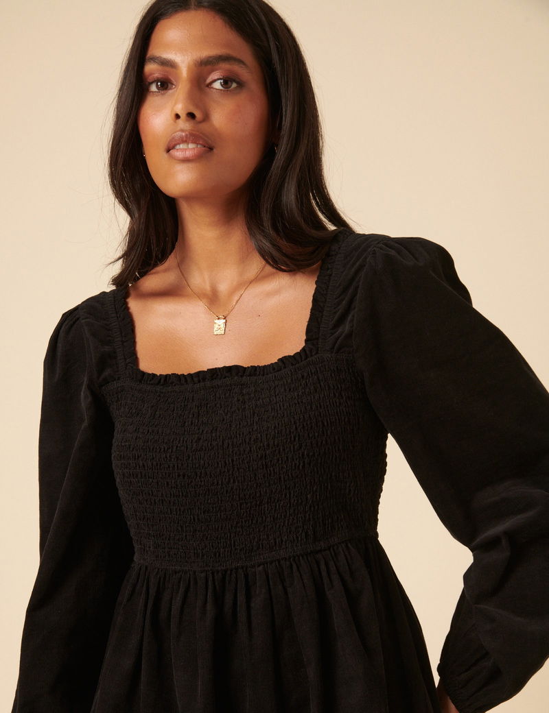 Black Balloon Sleeve Cord Tiered Elsa Mini Dress