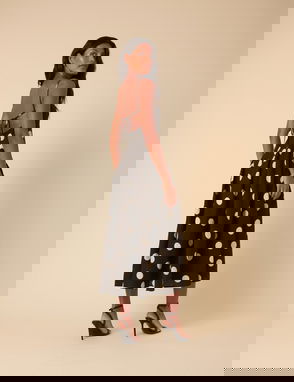 Coming in soft velvet, this black midi dress features a sweetheart neckline with a trio of white bows and short puff sleeves. The panelled waist shapes before falling to a relaxed silhouette.