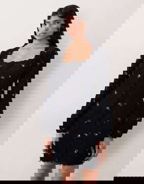 In soft cord, this black mini dress features blue floral embroidery and scalloped trims. Cut to a slim fit, it’s finished with a button front and neat seams for structure.