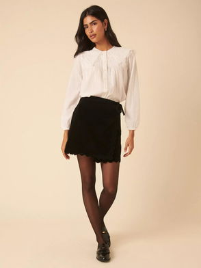 Meet your new mini skirt. Designed with wrap tie detail, this soft cord skirt features scalloped edging for an NC take on a classic. Add our blouse for your new go-to office look.