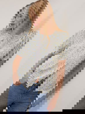 In soft cord, this floral blouse features a Peter Pan collar, long sleeves and a black button front. It's cut to a relaxed fit and finished with bobble-trim detailing.