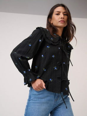The perfect autumn blouse. With pretty florals and a trio of string tie details at the front creating a so-now spin on a classic look. We’re obsessed with the billowing blouson sleeves and the understated round neck. Style with your favourite NC denim.