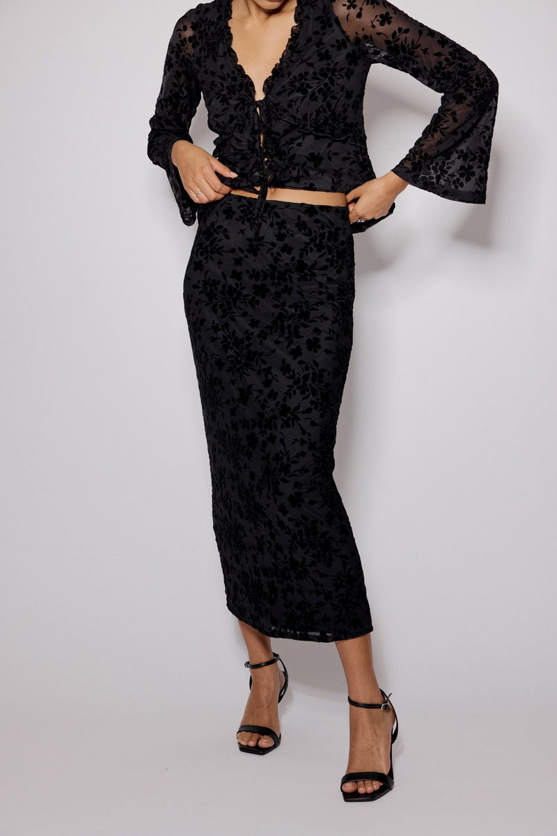 This maxi skirt is designed with black, lacy florals in a slim-fit silhouette. It’s finished with a floaty hem and pairs perfectly with our matching top.