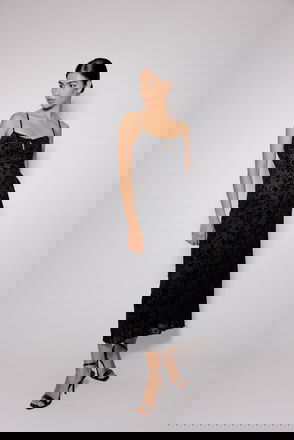 This black midi dress is cut from floral devoré velvet mesh with a luxe feel. It features a round neckline and long sheer sleeves that gently flare, falling to a slim silhouette.