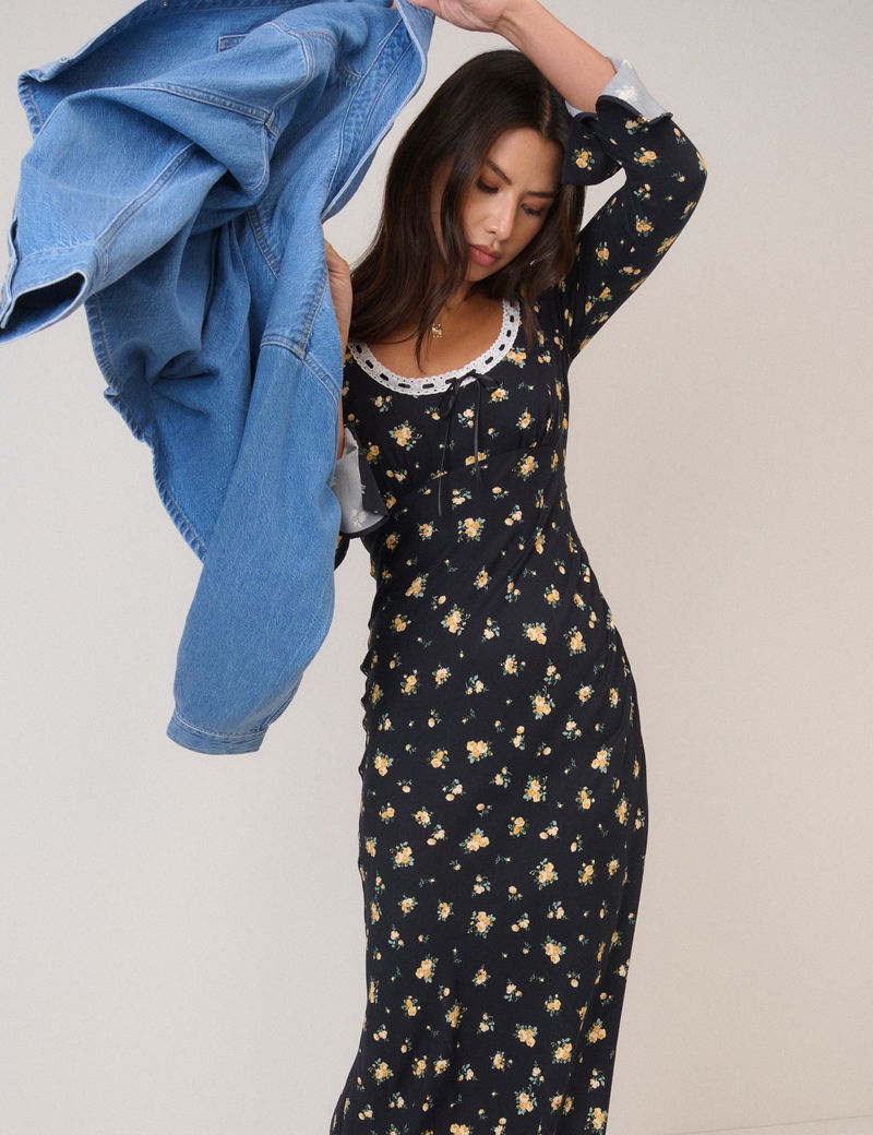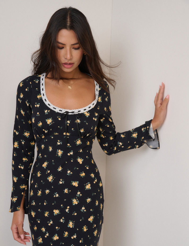 This black midi dress features yellow florals and a threaded scoop neckline trimmed with white lace. The empire waist shapes the slim-fit bodice before falling to a relaxed skirt. It's finished with a tie-back detail.