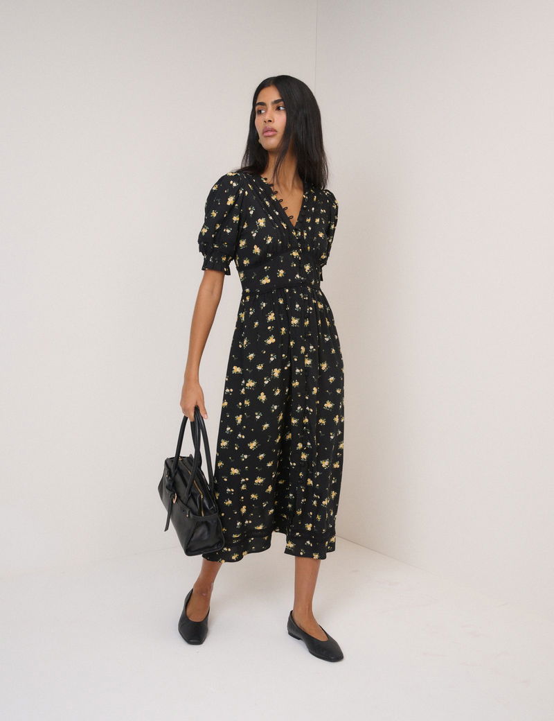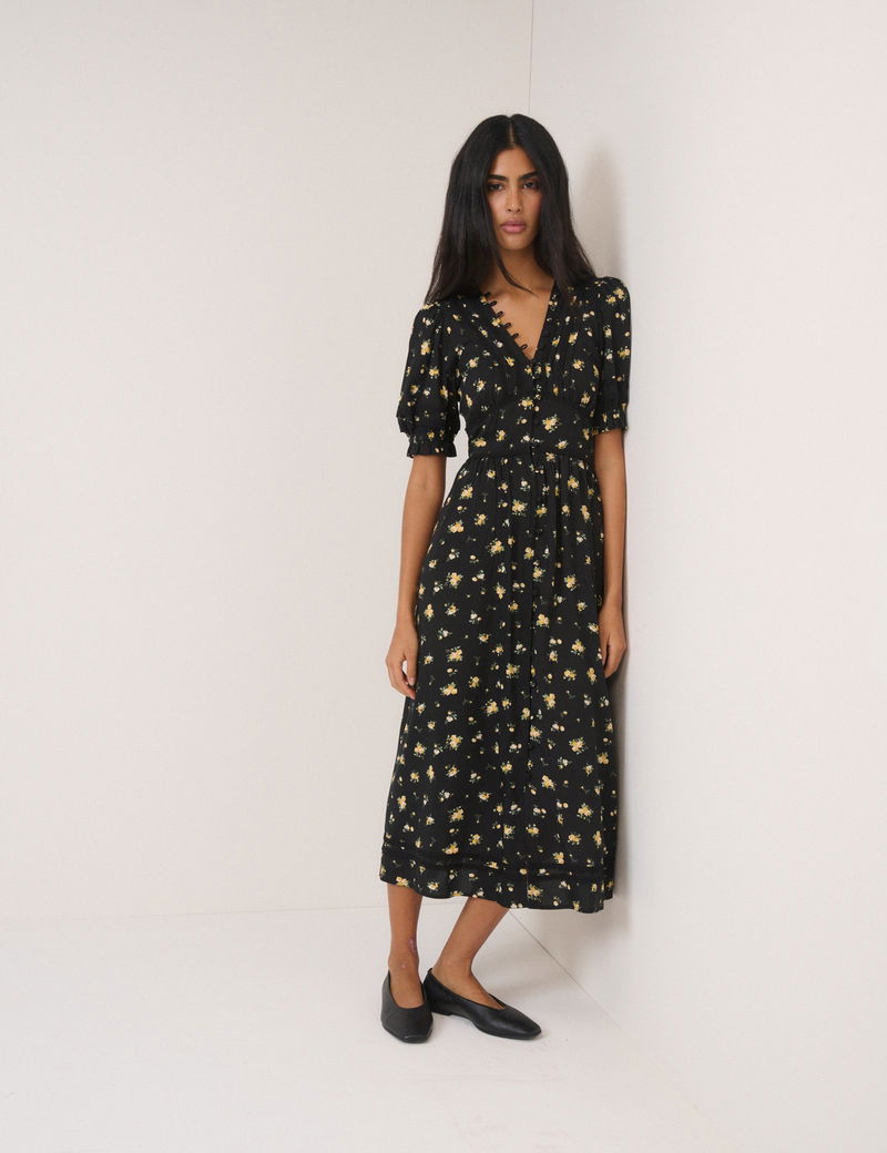 Designed with yellow florals, this black midi dress features a V-neckline framed by a button front and pintuck detailing. With intricate lace trims, the panelled waist shapes before falling to a relaxed skirt.