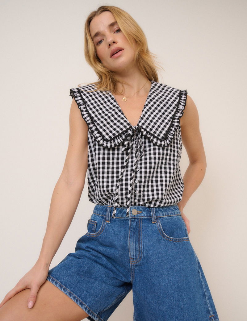 Black Gingham Ruffle Collar Button Through Top