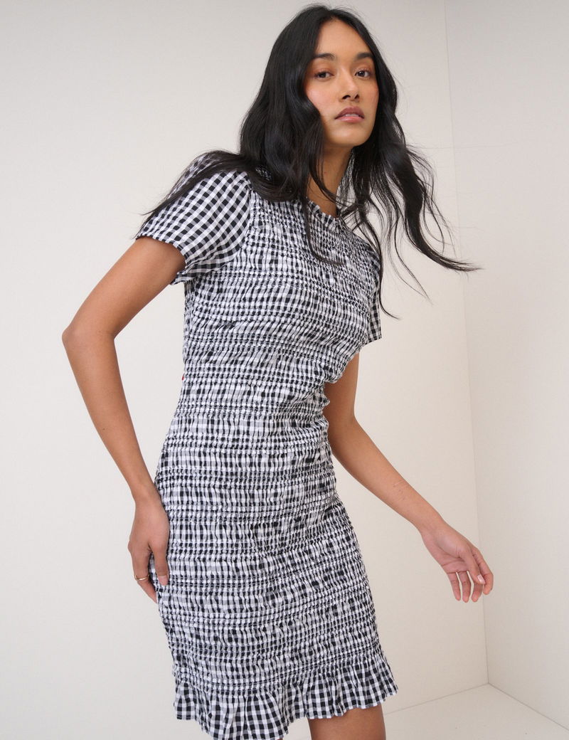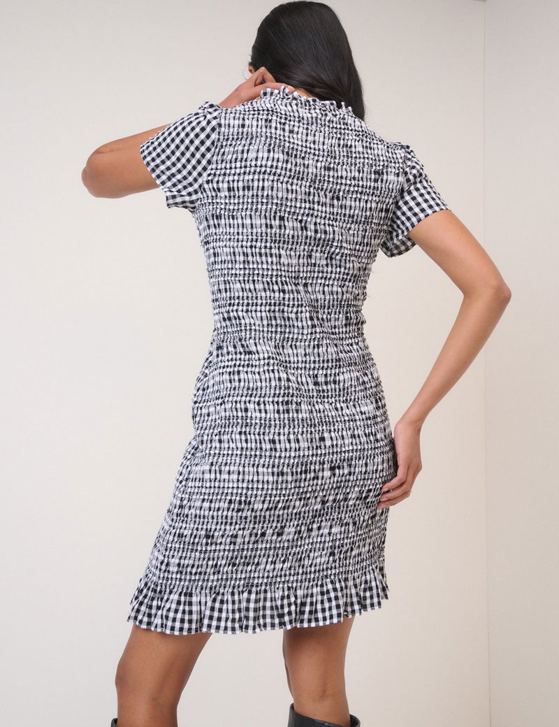 Crafted from soft pure cotton, this black and white gingham mini dress features a round neckline and short sleeves. All-over shirring adds comfort and stretch for a flattering fit. Cut to a close fit, it’s finished with a ruffle hem.