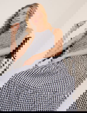 Your ultimate summer midi dress. Coming in black and white gingham, the Charlie dress features a round neck and statement shirring for the perfect fit. She falls to a tiered skirt with pockets.