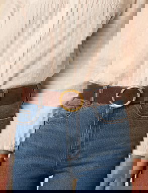This black leather belt features a gold-toned, circular buckle. Pair with our matching leather bag.