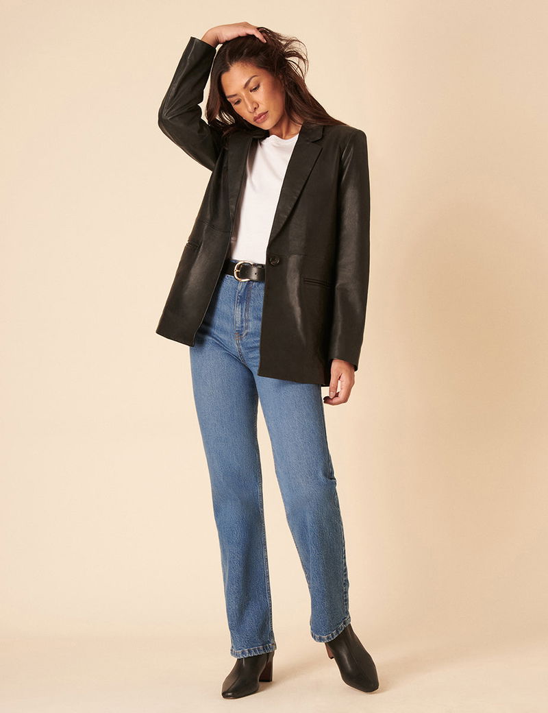 This premium leather blazer features a collar, long sleeves, and single-breasted button front. Finished with side pockets, the lightly structured silhouette balances its relaxed fit.