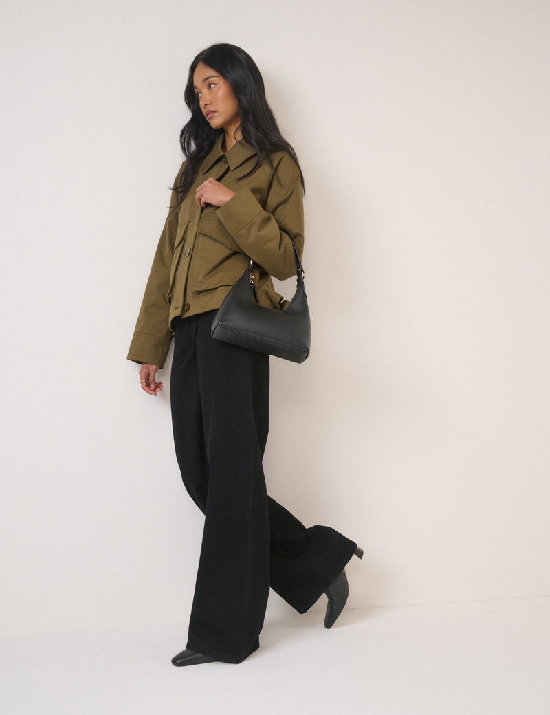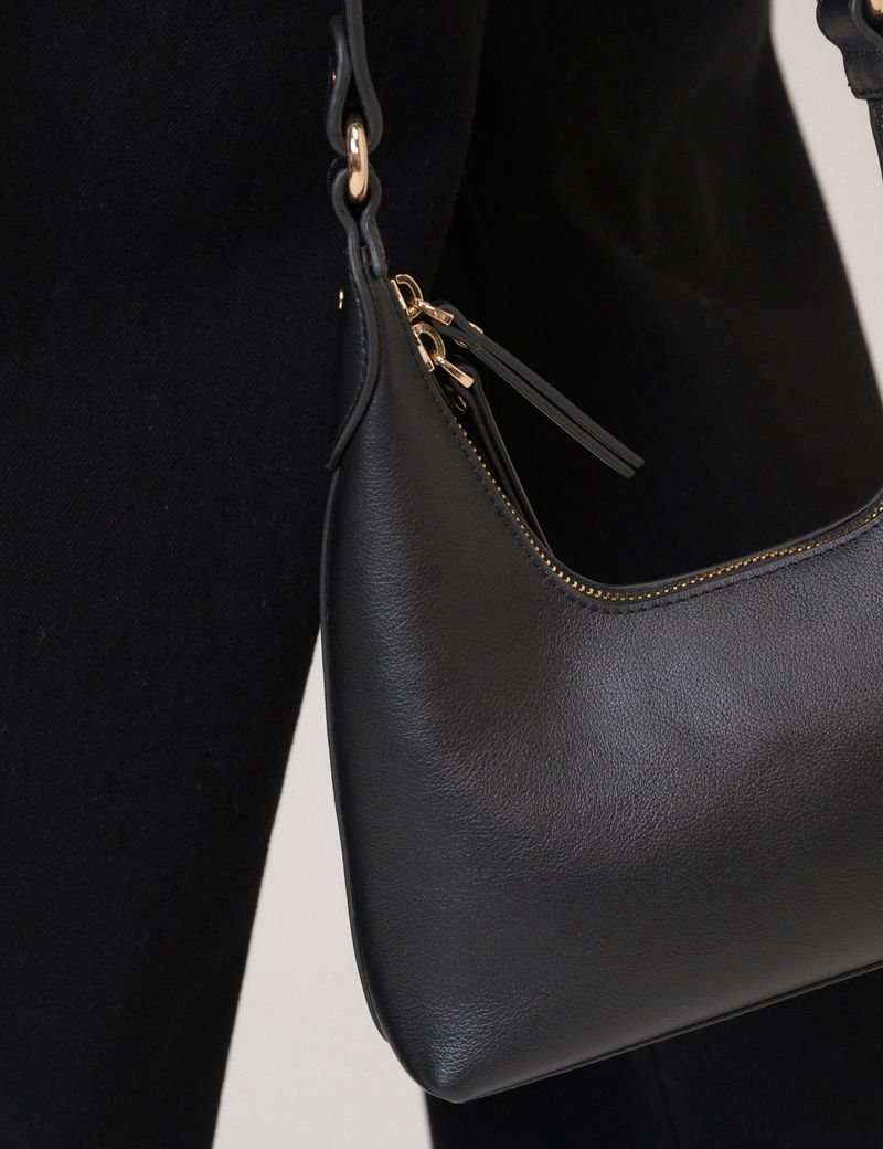 This black leather bag is designed with an over-the-shoulder style in a defined dipped structure. It’s finished with double zip fastenings with a gold-toned buckle.