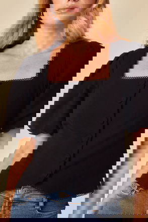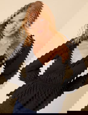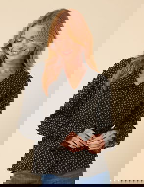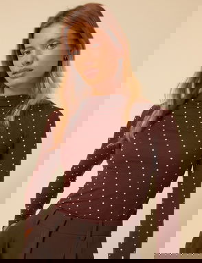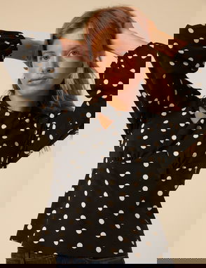 This black and white polka dot top features a round neckline and long fluted sleeves. The bodice nips in softly at the waist, before lightly flaring out at the hem.