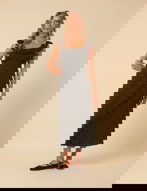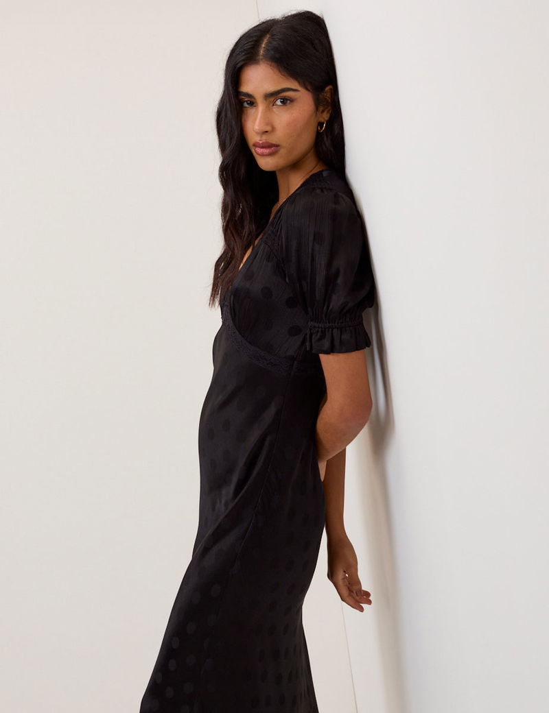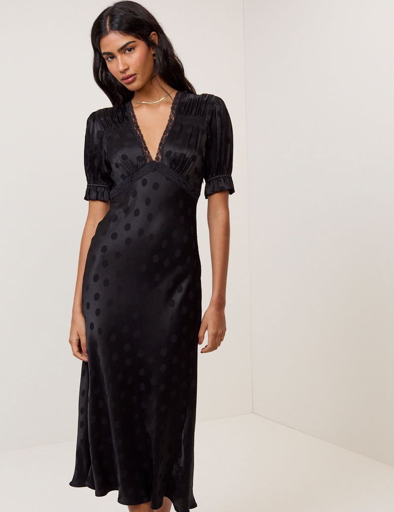 In black with polka dots, this satin midi dress features a lacy V-neckline and short puff sleeves with light ruching at the shoulders. Underbust seams shape before falling to a relaxed, lightly flared silhouette.