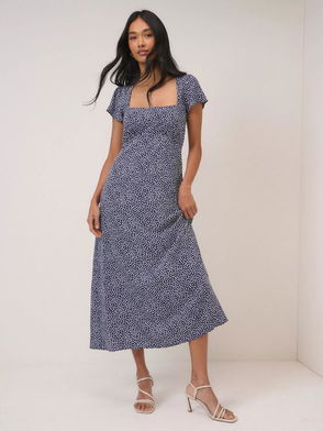 In a timeless black and white, this polka dot midi dress features a V-neckline, complete with neck tie detail. Underbust seams shape the fit before falling to a gently flared skirt.