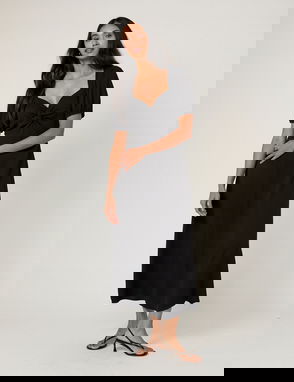 Coming in black with white polka dots, this midi dress features a square neck framed by a ruffled collar. The empire waistline shapes its relaxed skirt and the back reveals a tie detail so you can refine the fit.